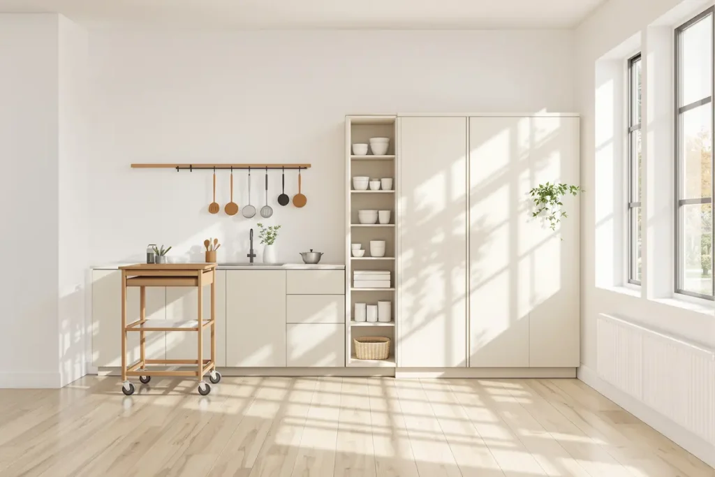 In compact apartments, a good trolley and space-saving storage wall can outshine any bulky island. And if everything has a place to park, the room stays clean—not cluttered.