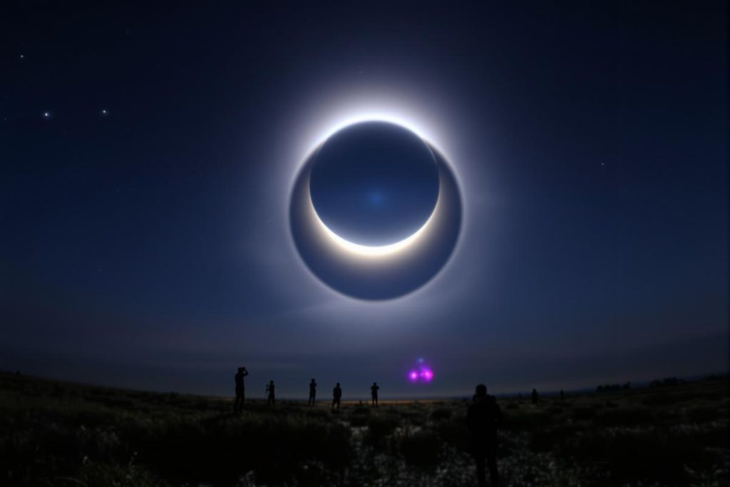- The Sun’s corona becomes visible—a glowing white halo